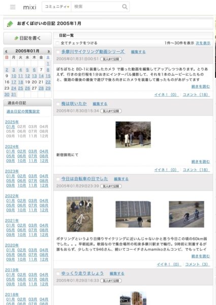 2005年のmixiの日記。ブラウザ版だとカレンダーから古い日記を引っ張り出せる。このUIはいい。