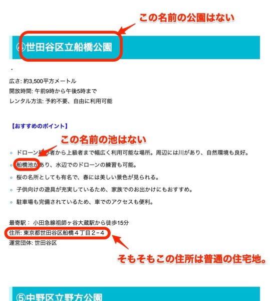 そもそも、23区の公園はすべてドローン禁止であるからはなから成り立たないのだけれども、それはそれとして、このサイトが生成AIによるものかダミーデータで仮に作られたものが公開されてしまったのかは判然としないが(いくら生成AIによるものとしてもデタラメがすぎるし、人間が作るなら架空の場所だとわかるようにするだろう)、今の時代、生成AIの出力をノーチェックで出してしまったといわれても不思議は無い。