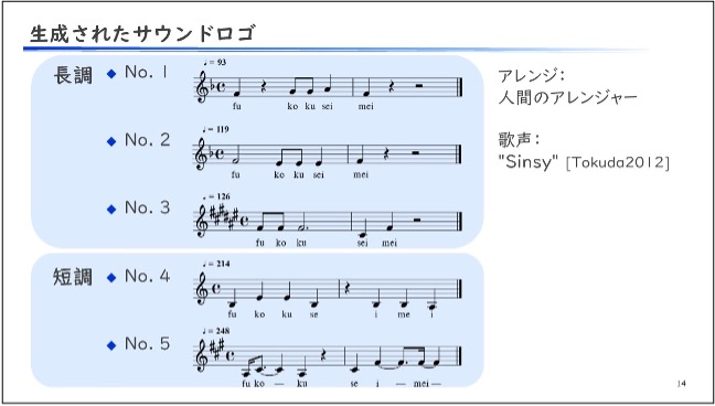 大谷 そこは重みづけをせずに長調のもの3案と短調のもの2案を生成し、100周年記念事業メンバーの方10人に選んでいただきました。5段階評価で選んだ結果と、最適だと思ったものを1つずつ選んだ結果とで選考したのですが、いずれも5番目のもの(図参照)が好評でした。