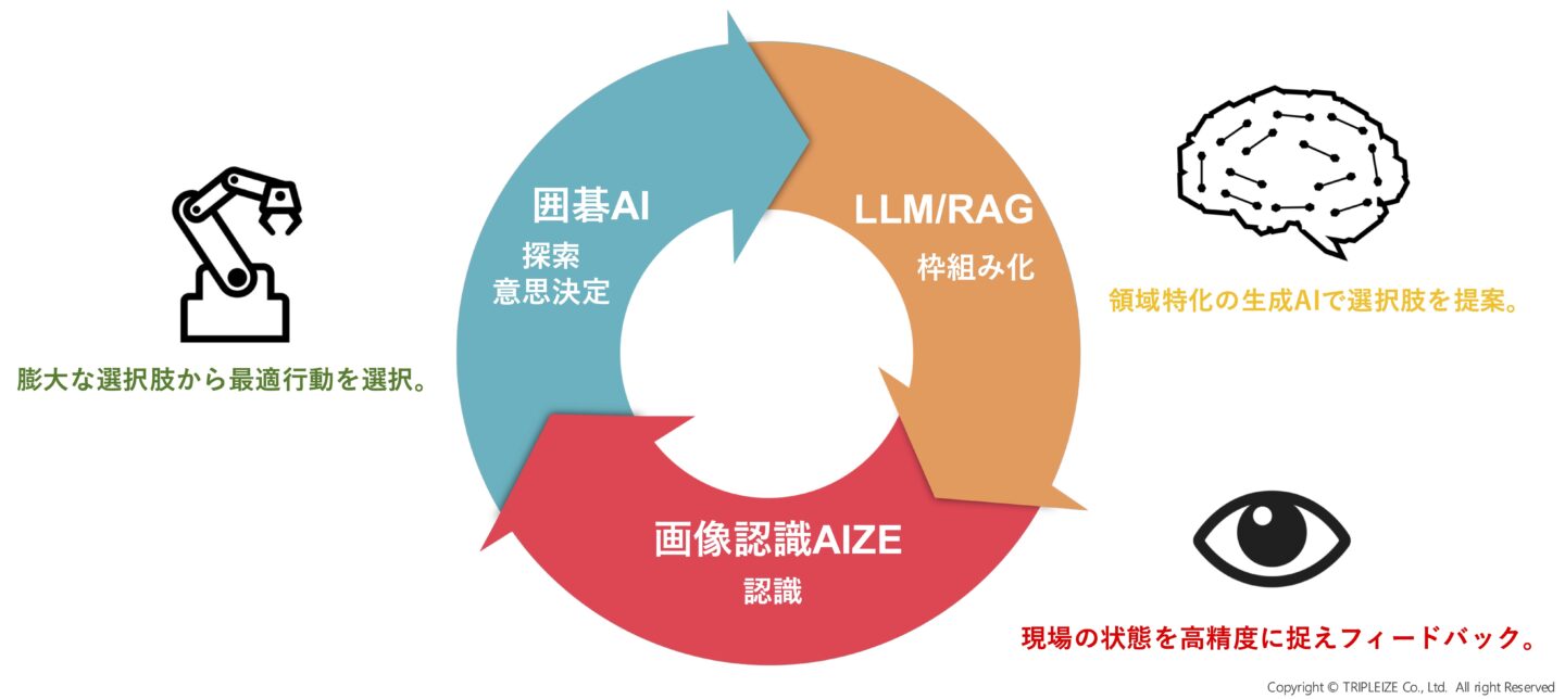 片渕 わたしの解釈になりますが、囲碁AIで鍛えた膨大な選択肢からの「探索」、画像認識のAIZEが担う「認識」、領域特化LLMによる「生成」の3つがフィジカルAIに必要な根幹技術だと思っています。フィジカルですから、たとえれば、脳がLLM、目が画像認識、行動実行が探索エンジンにあたると思っていて、これらの統合がこれから始まるというイメージです。